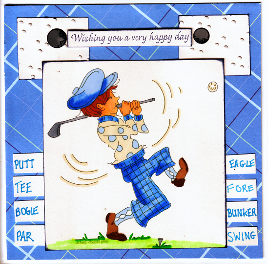 Found this lovely image over at SassyCheryls and immediately knew it would suit my son for his birthday. He reminds me of when my son was very young and just started to enjoy golf, he always swung like a mad man and anyone near him usually got clunked! The papers I have used are unmarked so not sure where they came from. I coloured the image using copics and promarkers. My copics are going so dry, will have to re ink or buy new ones. I hand wrote the wording (as if you couldn't guess lol) added some embossed squares and a sentiment. This card fits these challenges;
