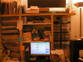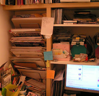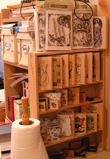 Bit of a dull picture but it shows my computer screen, above which I store my flat pack stamps, peel offs, cds and notepads. On the very top shelf I have different coloured card, watercolour pads,and the two blue packs are full of wooden stamps waiting to be shelved.