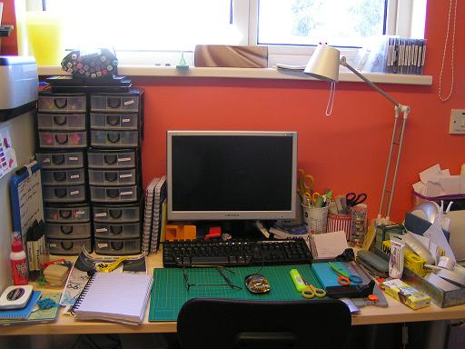 To the left of my computer I have racks for magazines, papers, 3d sheets etc and little pots for my pens and pencils.