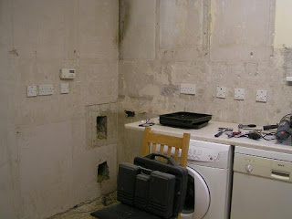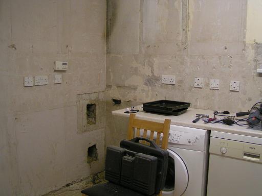 This is how it started out. This was our old kitchen. We have ripped the tiles off and begun to dismantle the old cupboards and move all the machine to the new utility room.